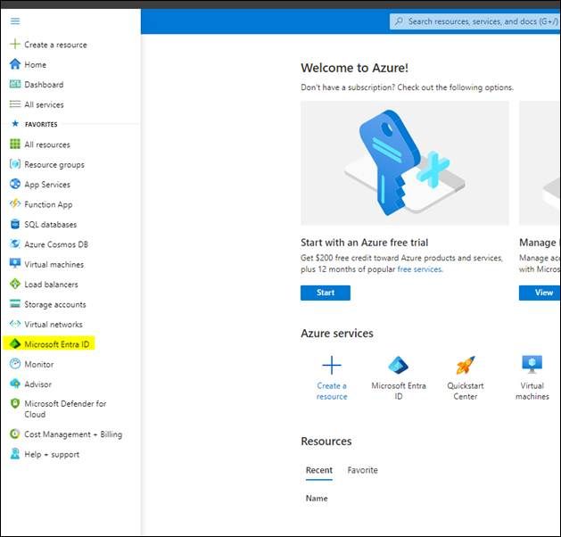 a. In the Azure portal select the Microsoft Entra ID in left navigation menu.